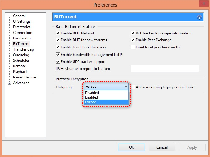 Preferences - Choose ‘BitTorrent,’ and in the Protocol Encryption section, change the ‘Outgoing’ option from Disabled to Forced.