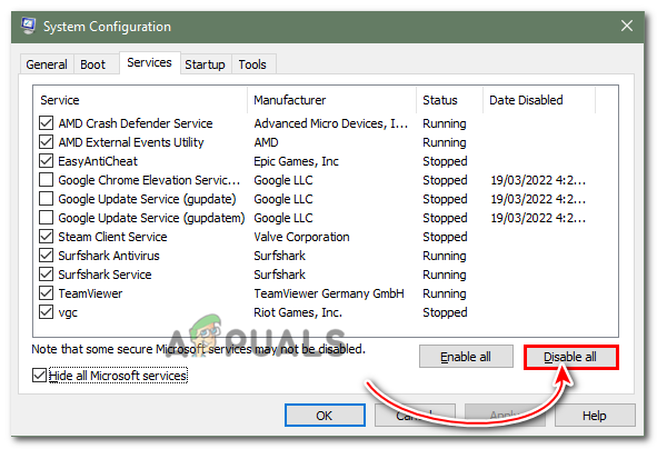 Check Hide all Microsoft services - After hiding all Microsoft services click on disable all option and press apply Ok