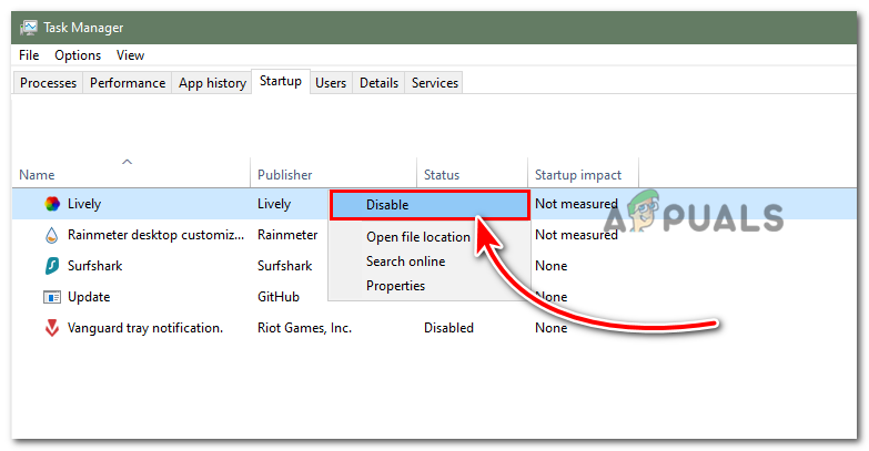 - After opening the task manager go to the startup tab and disable all items in the startup tab