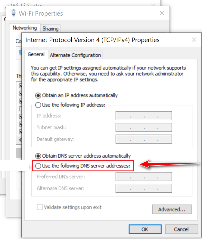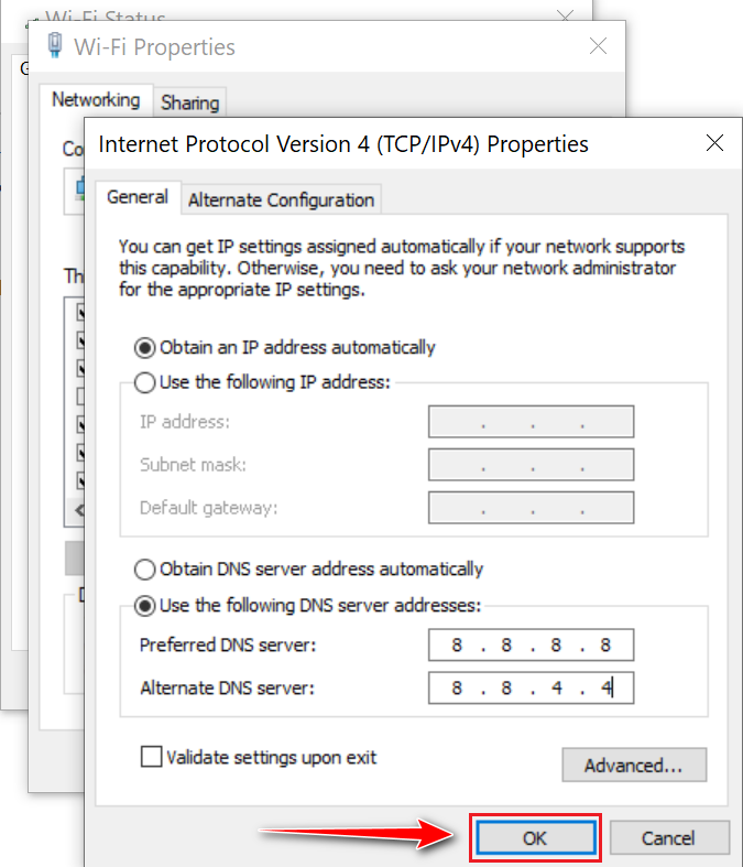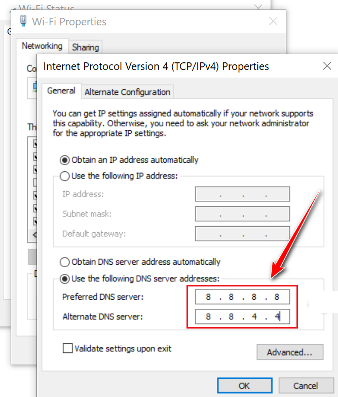 - Enter “8.8.8.8” for Preferred DNS server and “8.8.4.4” for Alternate DNS server.
