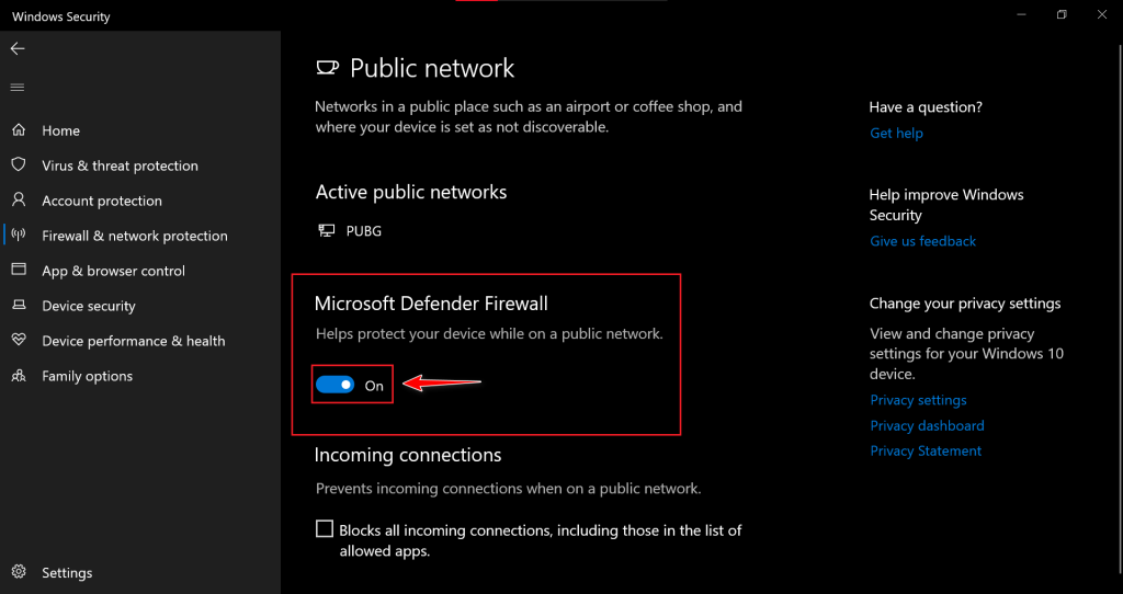 - Toggle the Microsoft Defender Firewall to Off.