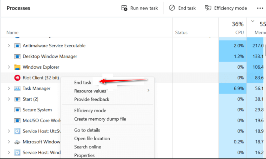 - In Task Manager, find and click on Riot Client to select it. There may be more than one instance.