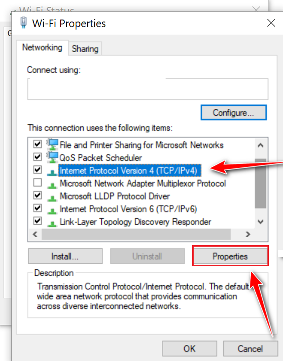 - Select “Internet Protocol Version 4 (TCP/IPv4)” and click Properties.