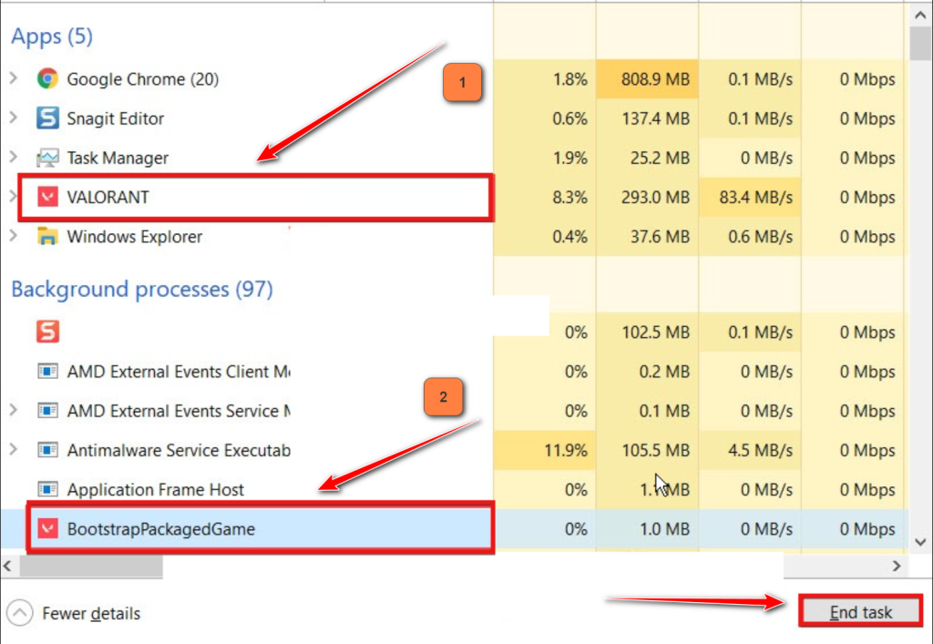 - Do the same for the VALORANT task: select it and click End Task.