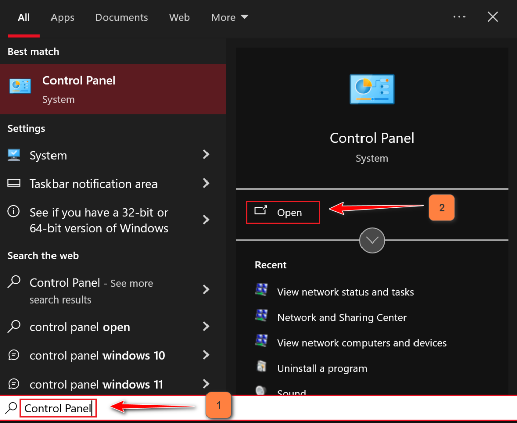 - Search for “Control Panel” in the Windows search box and click Open.