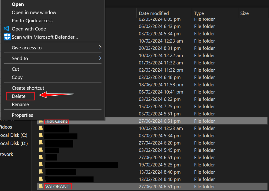 - In the file explorer window that opens, find the folders named “Riot Client” and “VALORANT”.