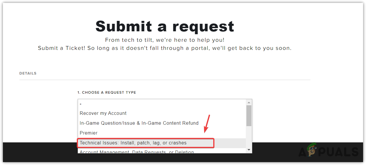 - Select the Request type, which should be Technical Issues: Install, patch, lag, or crashes.