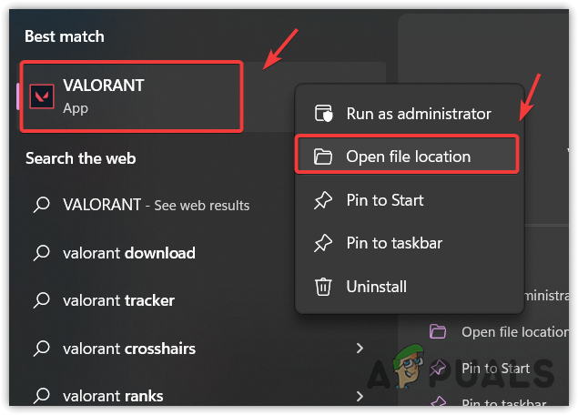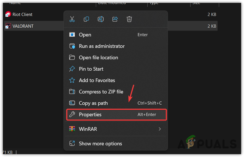 - Right-click the VALORANT icon and go to Properties. In case you don’t use the VALORANT shortcut, press the Win key, type VALORANT, right-click on it, and select Open file location.