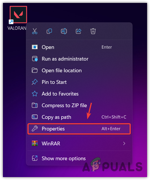 - Right-click VALORANT and select Properties. If you don’t have a shortcut created, press the Windows key and type VALORANT.