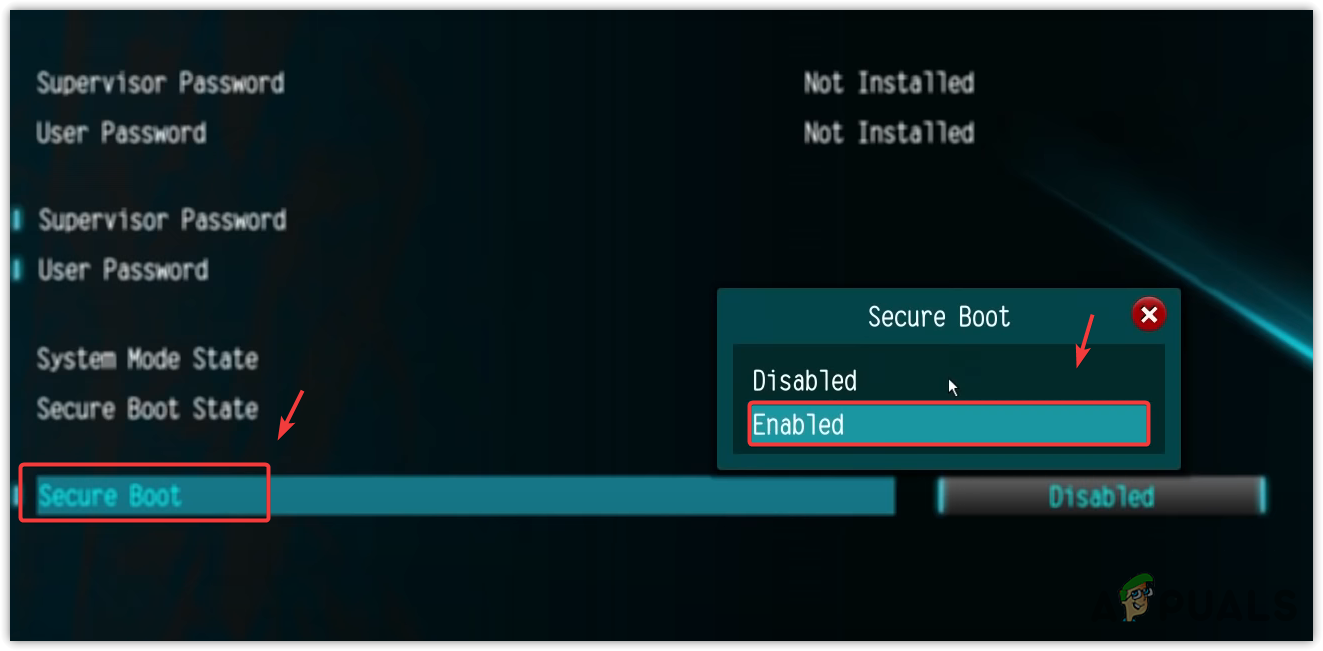 - Once done, enable it. Then, find the Secure Boot option in the security settings or boot settings and enable it as well.