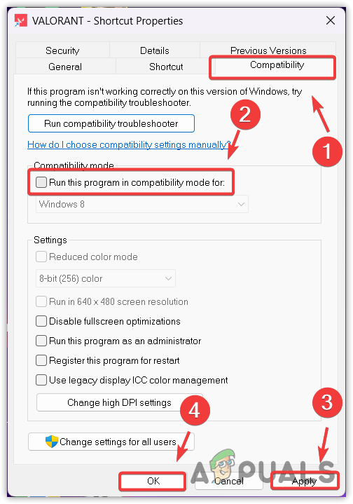 As previously discussed, compatibility mode is typically used for running programs with older versions of Windows. However, VALORANT cannot operate with older versions, even when the compatibility settings are adjusted on the latest version. This holds particularly true when the user encounters this specific error. As a result, we should attempt to disable compatibility mode by following these steps: