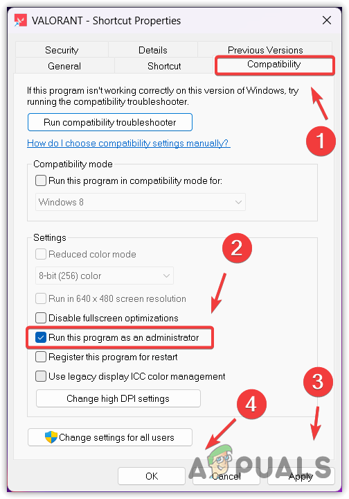 To fix this error, you will have to run the VALORANT as an administrator, along with disabling the compatibility mode by accessing the VALORANT properties.