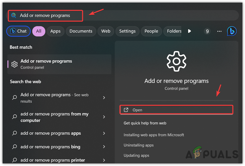 - Press the Win key and type Add or remove programs.