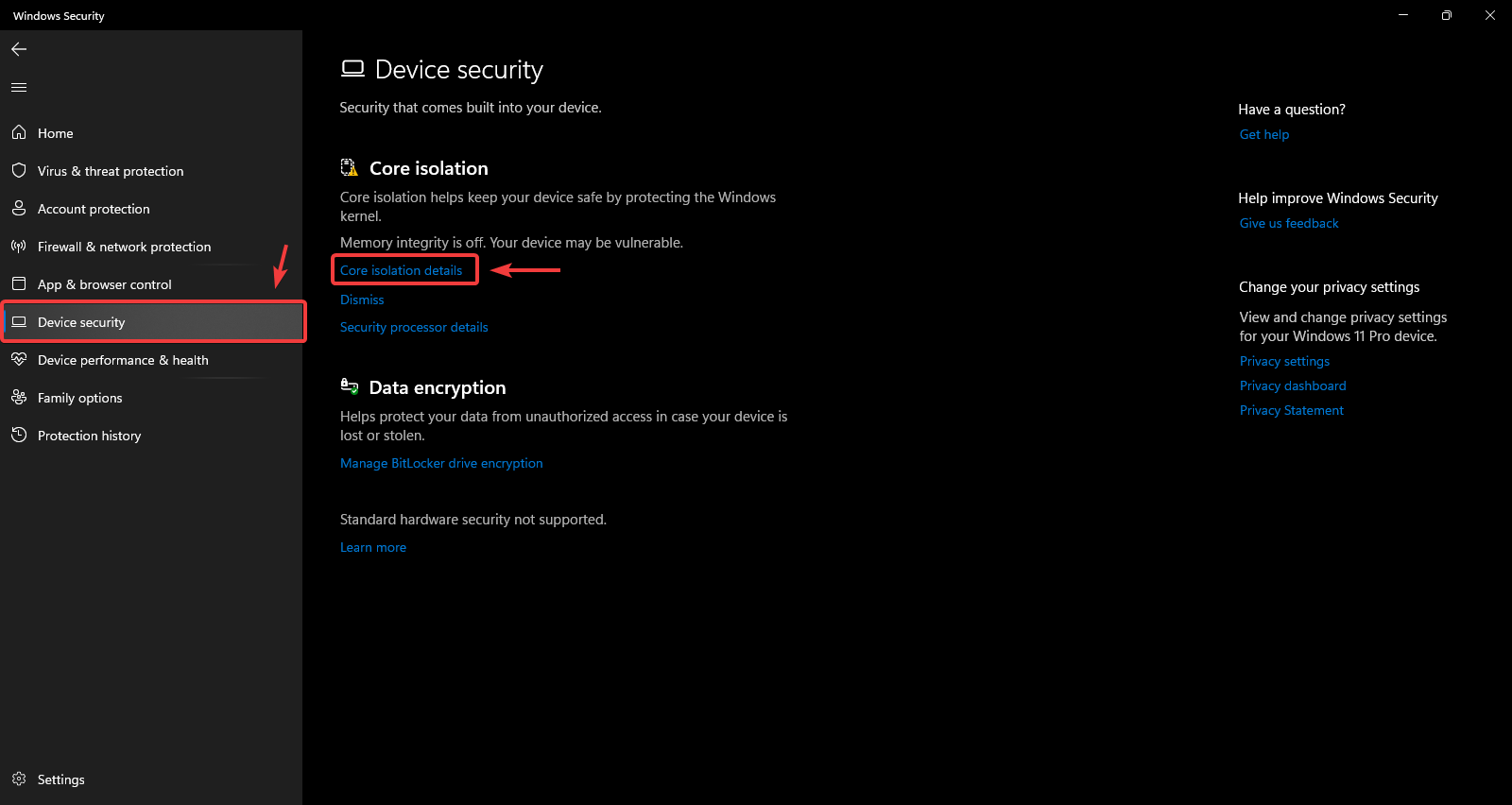 - Select Device Security from the sidebar and click Core Isolation Details.