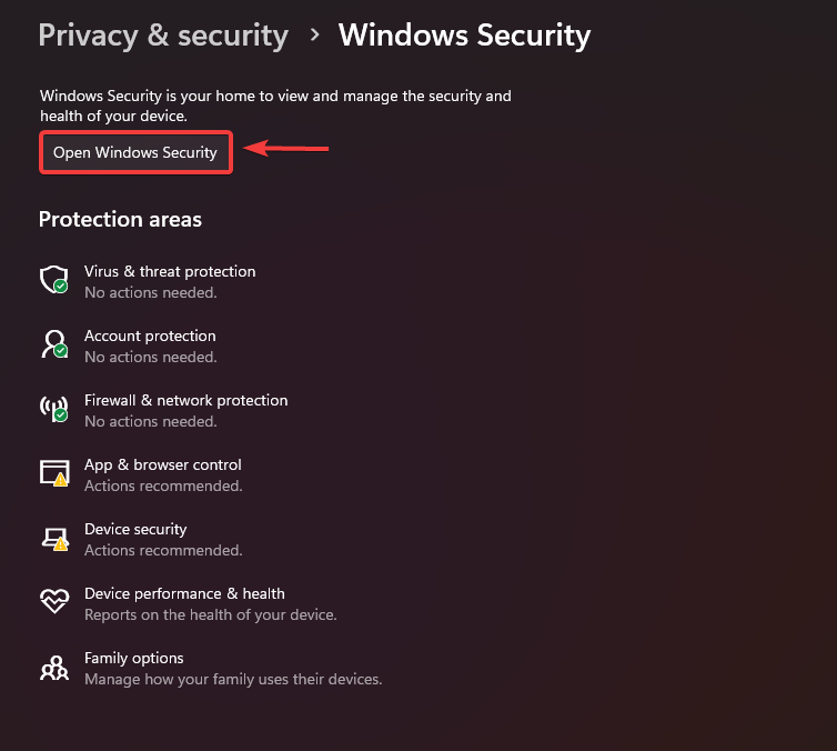 - Navigate to Privacy and Security from the left pane and select the Windows Security page.
