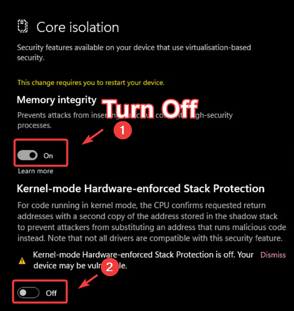 - Turn off Memory Integrity and Hardware-enforced Stack Protection.