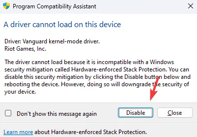 When presented with the Vanguard Kernel-Mode Driver error screen, click ‘Disable,’ then restart your computer to deactivate the Hardware-enforced Stack Protection.