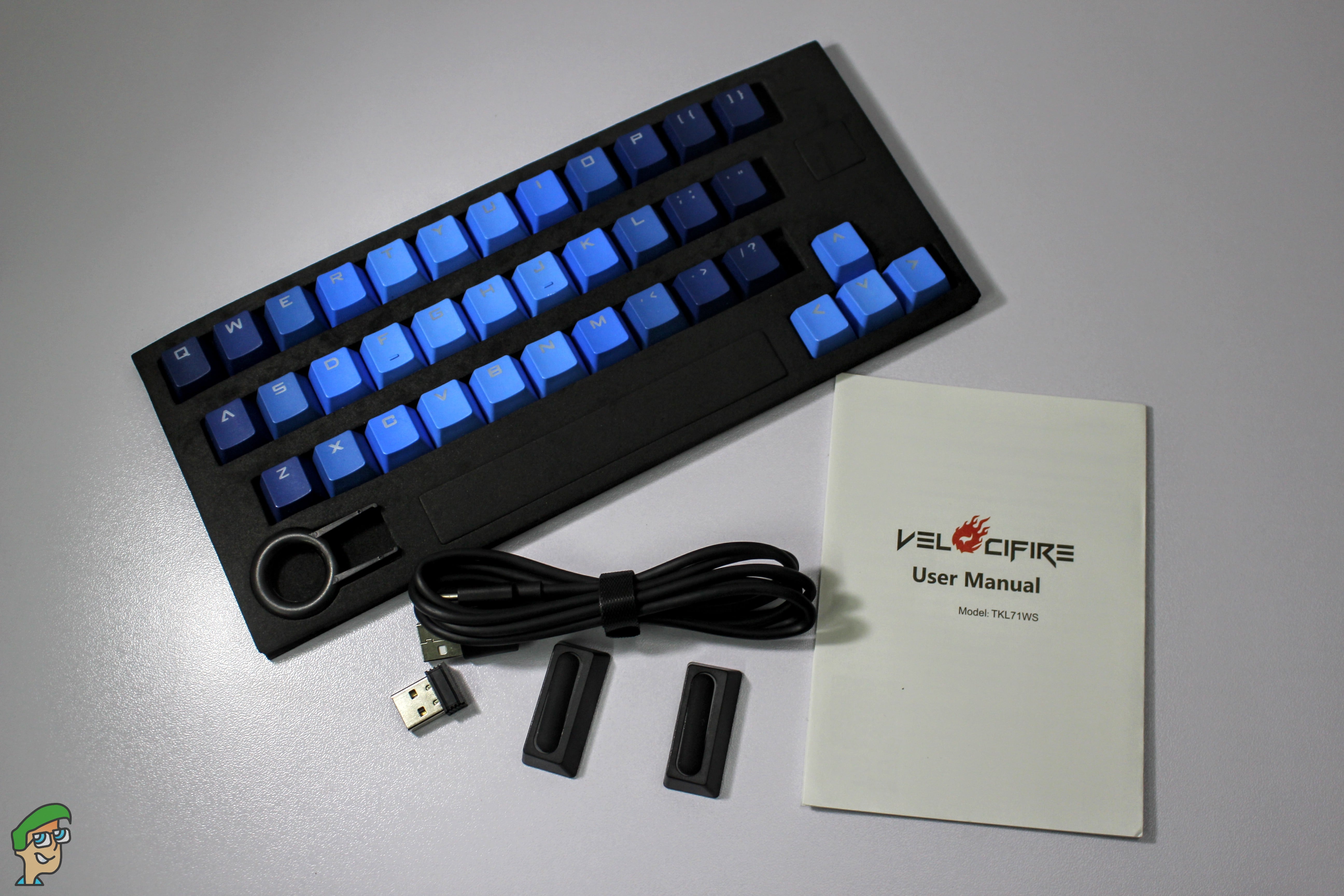 As movies will tell you, the real stuff that matters is on the inside (cheesy, I know). If you go to the product page, you’ll find a few different options when checking out. The base option is just the keyboard itself. If you want, you can get a pair of blue K37 PBT keycaps, and a keyboard bag for carrying it around. Velocifire was nice enough to send us the K37 PBT keycaps, which I really love (more on that later).