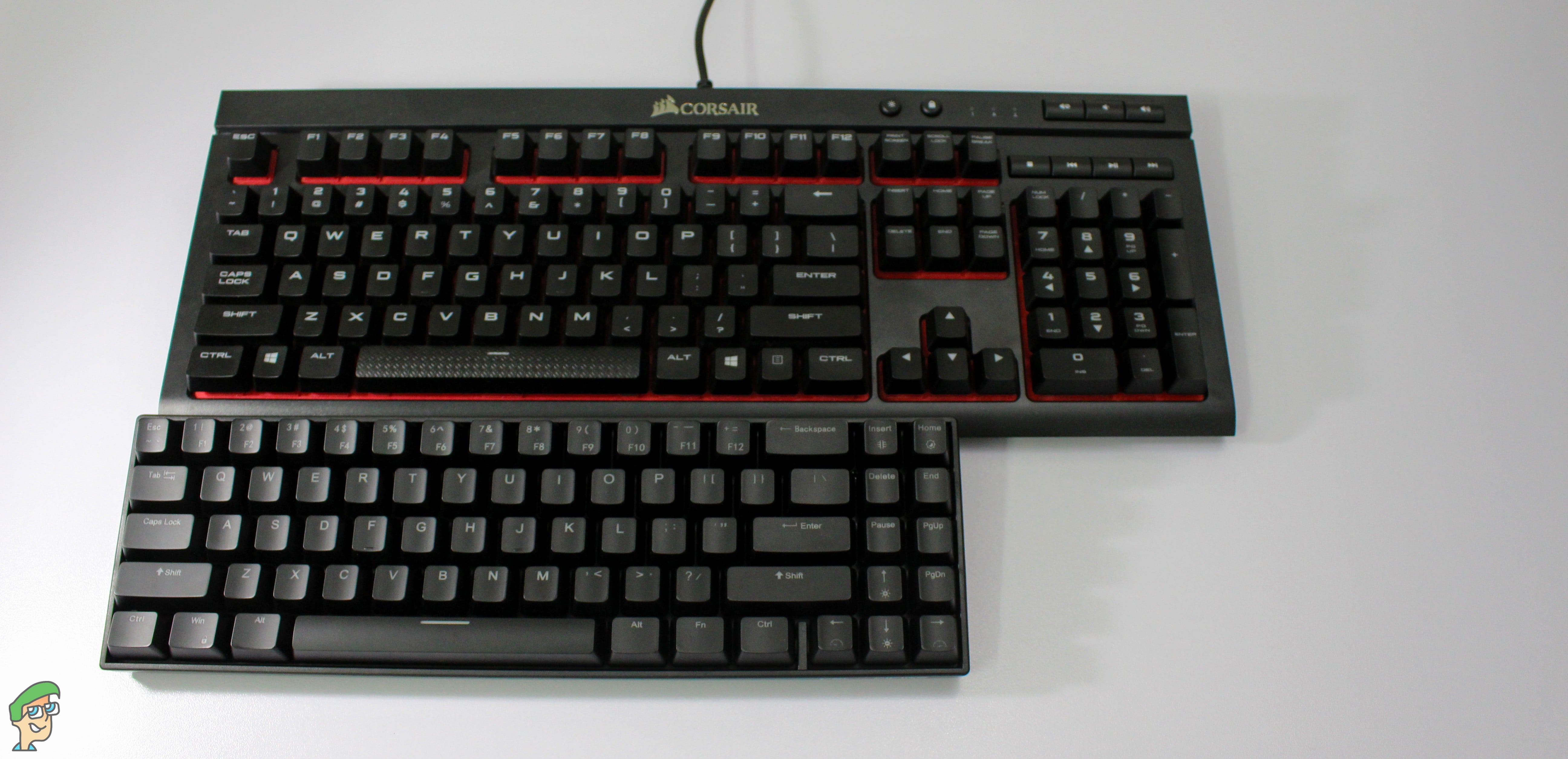 Just to show you how small this Velocifire keyboard is, we put it side by side with the Corsair K68. The K68 is a full-sized Cherry MX Red keyboard, and it absolutely dwarfs the TKL71WS. This goes to show just how portable this little thing is.