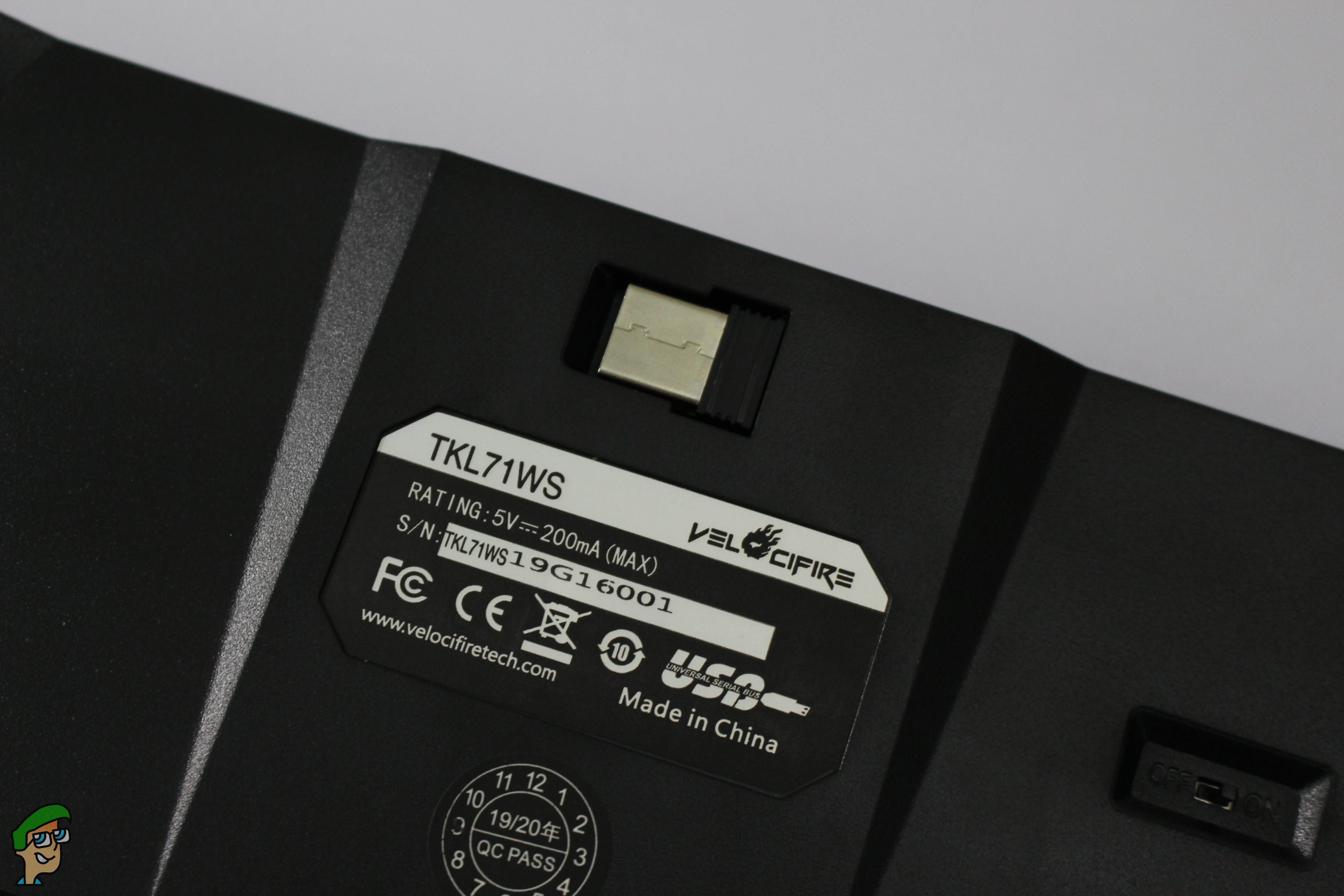 Okay, I’ve gushed over the design for long enough. Let’s have a look around the chassis. The frame of this keyboard is built out of hard plastic, but it doesn’t feel cheap in any way. Near the bottom right, we have the Velocifire logo. At the back, we have the on/off switch, rubber feet to prevent scratching and a place near the top to tuck in the USB dongle. After removing the dongle from this position a couple of times, I realized the slot is magnetic, so it doesn’t fall off. This is definitely a nice touch.