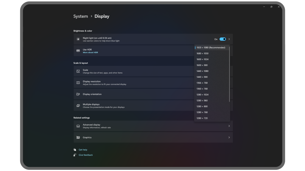 In some cases, an incorrect screen resolution or an incompatible graphics driver can also cause issues with how your laptop’s screen displays content. To check if this is the case with your laptop, boot it up and go to the Display settings. Try lowering the resolution to see if there’s an improvement.