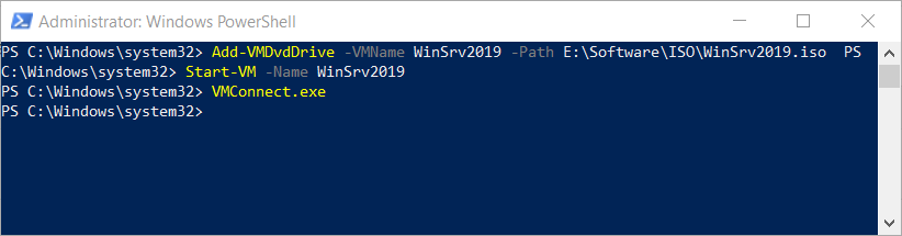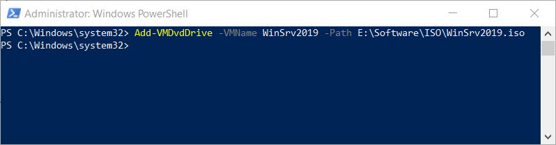 Add-VMDvdDrive -VMName WinSrv2019 -Path E:\Software\ISO\WinSrv2019.iso