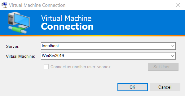 - Select the Server and Virtual Machine and then click OK. In our case Server is localhost and the virtual machine is WinSrv2019.