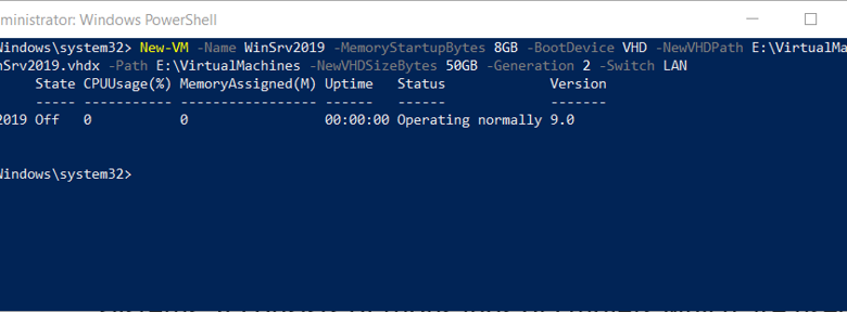 New-VM -Name WinSrv2019 -MemoryStartupBytes 8GB -BootDevice VHD -NewVHDPath E:\VirtualMachines\WinSrv2019.vhdx -Path E:\VirtualMachines -NewVHDSizeBytes 50GB -Generation 2 -Switch LAN