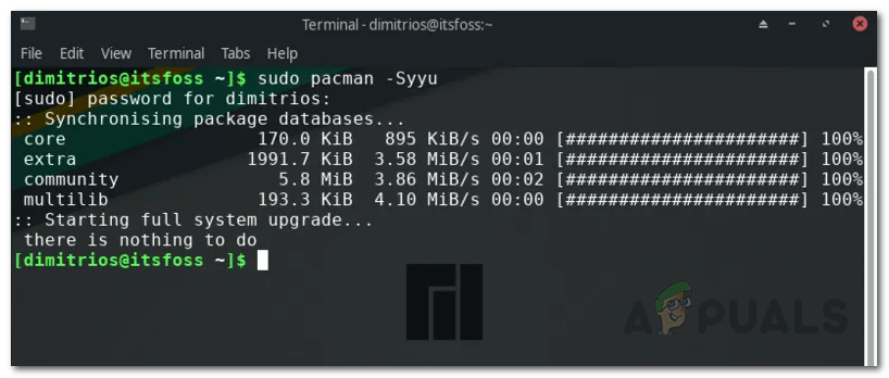 - Then, before you update the package, make sure to update the package databases. The following command is for Arch users.
