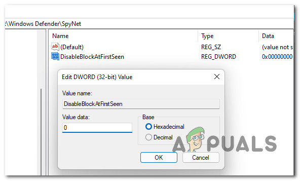 Dword Value - Next, name the newly created Dword to DisableBlockAtFirstSeen, then double-click on it and set the Base to Hexadecimal and the value to 0.