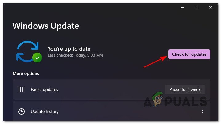 Open the Windows Update screen - Once you’re inside the Windows Update screen, move over to the right-hand section and click on Check for Updates to see if the Cumulative Update that fixes this issue is still not installed.