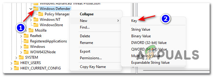 - Next, right-click on the Windows Defender key and choose New > Key from the context menu that just appeared.