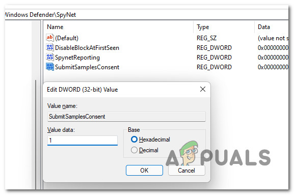 - Name this last key SubmitSamplesConsent, then double-click on it and set the Base to Hexadecimal and the Value data to 1 before clicking Ok to save the changes.