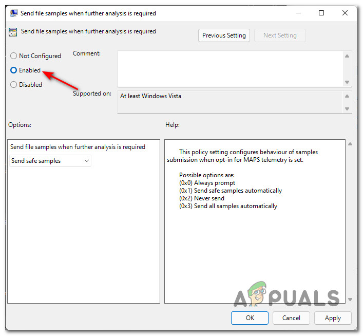 Open the File Sample Policy on Windows 11 - Next, from the Send file samples when further analysis is required policy, set the status of the policy to Enabled and click Apply to save the changes.