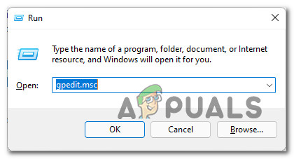 - Press Windows key + R to open up a Run dialog box. Next, type ‘gpedit.msc’ inside the text box and press Enter to open up the Local Group Policy Editor in Windows 11.