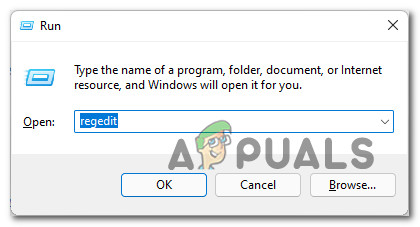 - Press Windows key +R key to open up the Run dialog box. Next, type ‘regedit’ inside the text box and press Ctrl + Shift + Enter to open up the Registry Editor with admin access.
