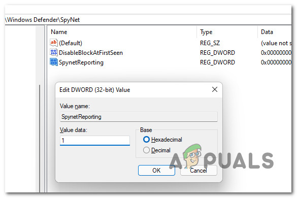 - Name the newly created Dword to SpynetReporting, then double-click on it and set the Base to Hexadecimal and the Value Data to 1.