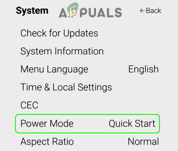 - Wrong Configuration of the Power Mode of the TV: If the power mode of your TV i.e., Quick Mode or Eco Mode is not compatible with the other device (like a cable box), then the TV may not turn on.