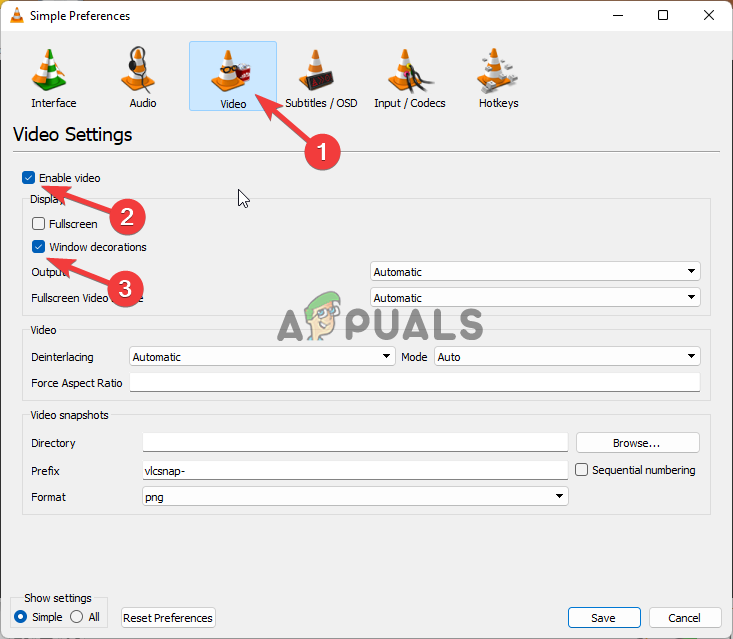 Open VLC Preferences - Now, go to the Video section and check the boxes for Enable video & Windows decorations.