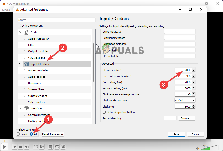 - Now, select the option Input/ Codecs. Here, change the File caching (ms) to 2000 or higher limit.