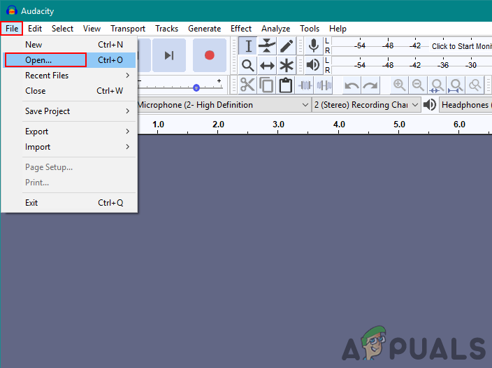 Selecting the Open option in the File menu - Find the audio file that you want to remove vocals from and open it.