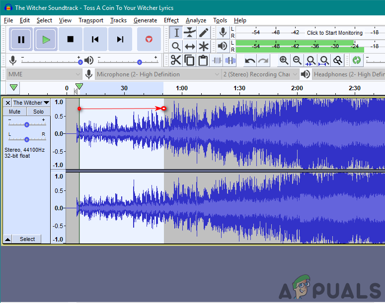 - Select the part of the track where vocals exist by left-clicking on the track with the mouse as shown below: