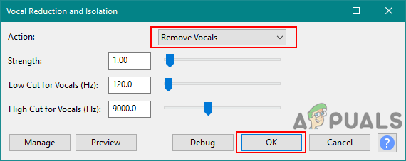 Opening the Vocal reduction and isolation - Change the action to Remove Vocals and click the Ok button.