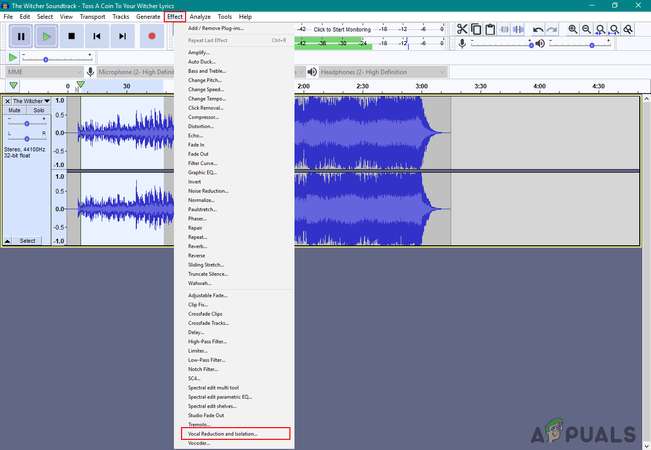Selecting part of the track - Click on the Effect menu in the menu bar and choose the Vocal reduction and isolation option.