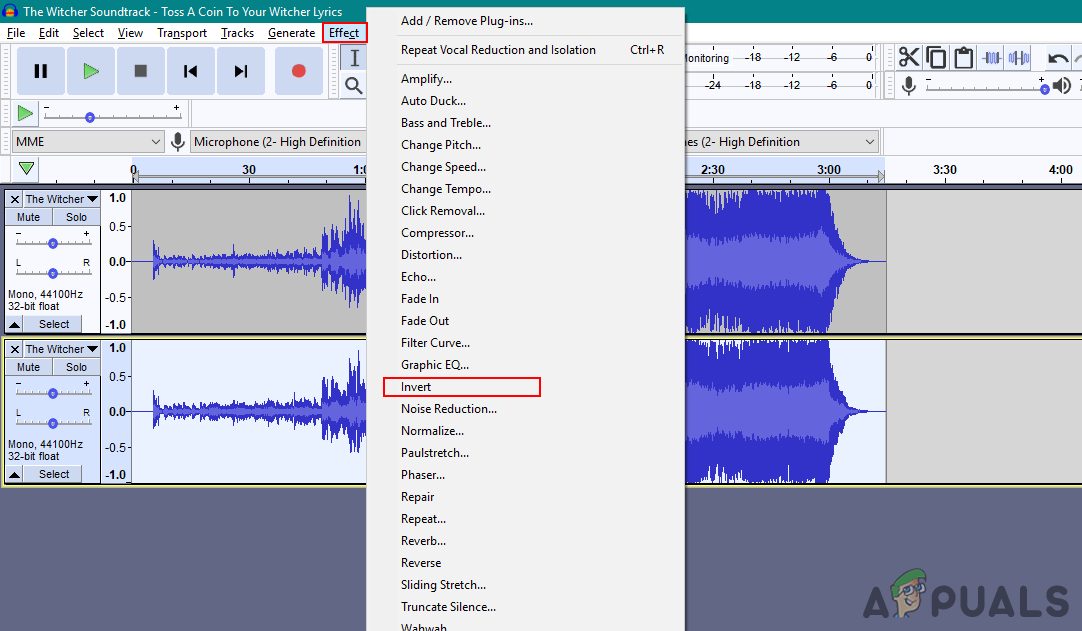 Splitting track channels - Now double-click the bottom channel to select the full track. Click on the Effect menu in the menu bar and choose the Invert option.
