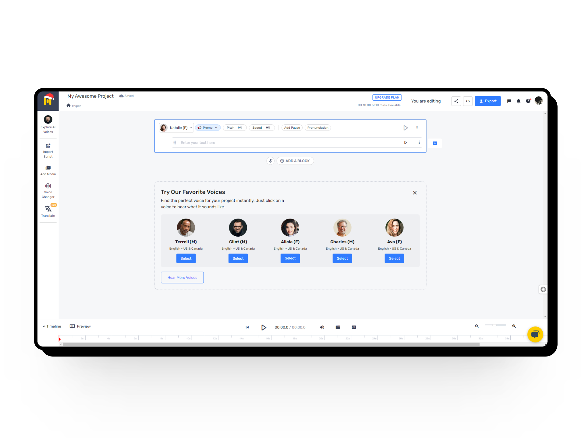 Murf lets you upload or type scripts, and then choose parameters like dialects, genders, and ages to give your AI-generated voice a realistic touch. You can also edit pitch, speed, insert pauses, and even eliminate filler words to craft the perfect voiceover. With over 120+ AI voices, it’s ideal for podcast creation.