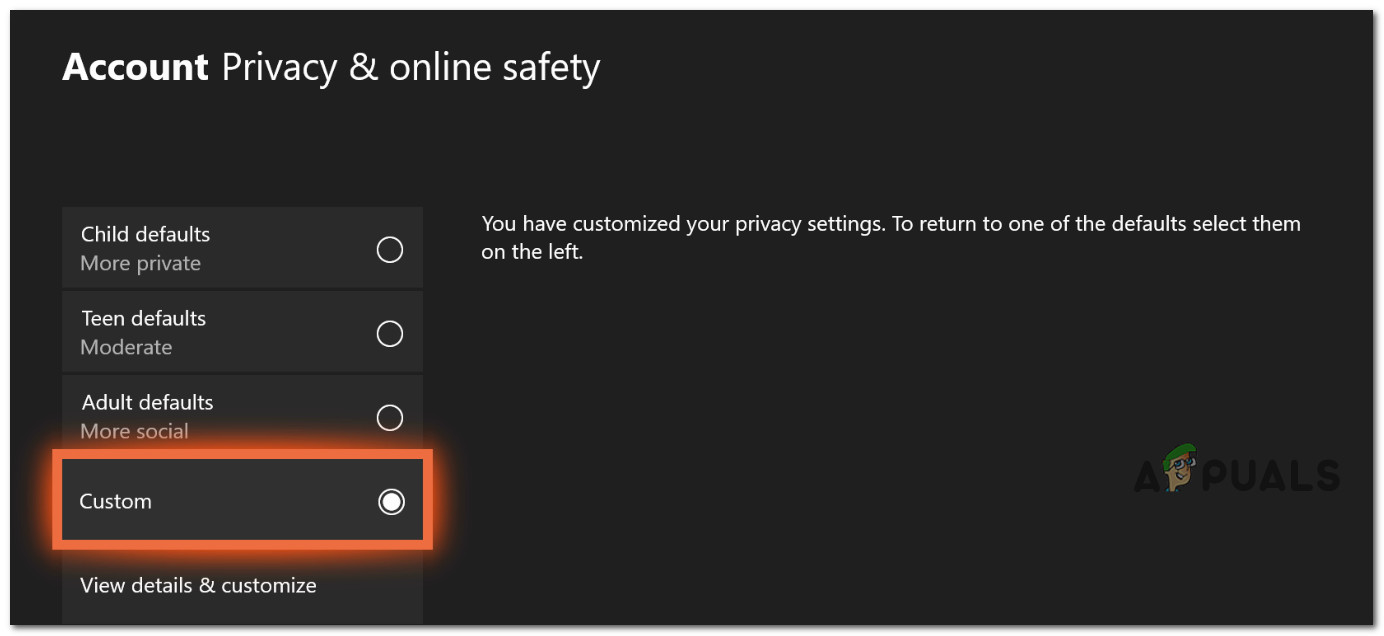 - From the next menu, select Custom once you see the list of various privacy presets.