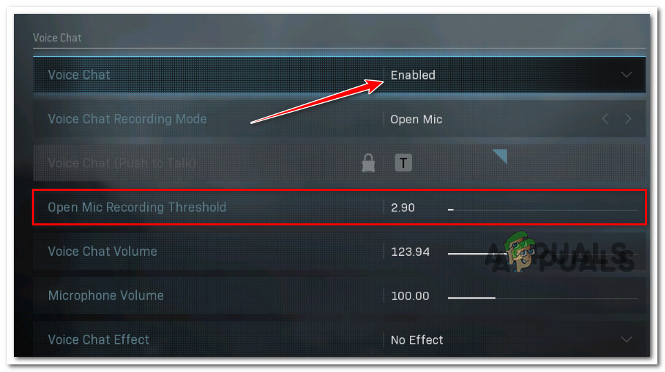 - Microphone Recording Threshold is too High – According to many affected users, one of the most common scenarios where you will face this issue is a scenario where the current Open Mic Recording Threshold is set to a high level. If this scenario is applicable, you can fix this issue by setting the Open Mic Recording Threshold level to Minimum from the Voice Chat audio settings.