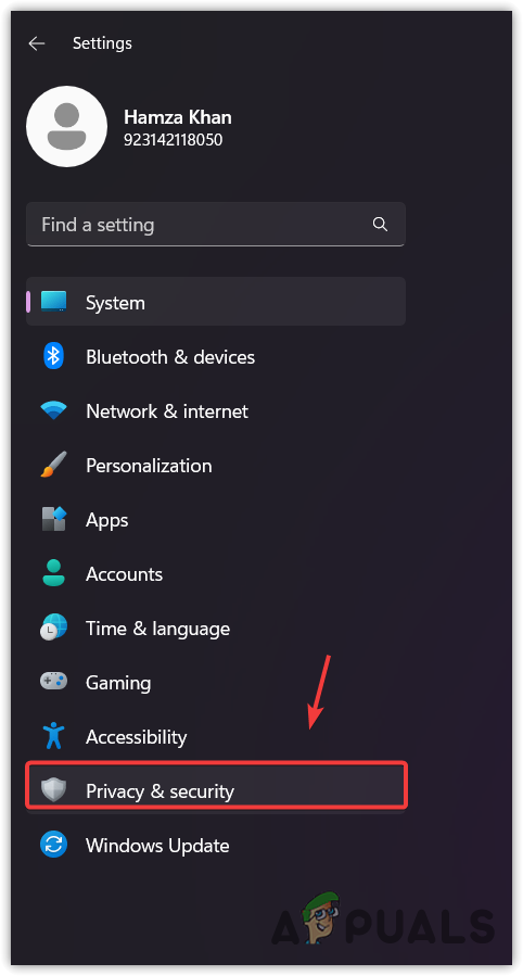 - From the left pane, pick Privacy & Security.