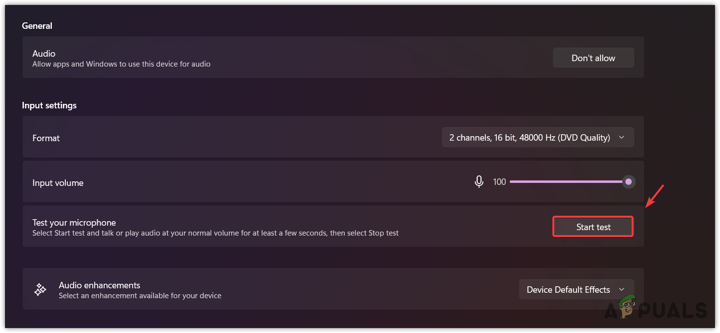 - Initiate a Start test to confirm if Windows can receive audio from the microphone.